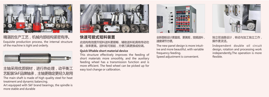 佛山重型四軸四面刨,佛山雙面刨鋸機(jī),木工機(jī)械設(shè)備,廣東優(yōu)質(zhì)廠家木工加工機(jī)械,廣東雙面刨鋸機(jī) 全新面板設(shè)計(jì)更直觀,更美觀,變頻送料,速度調(diào)節(jié)方便??焖倏上剖蕉塘涎b置,獨(dú)立雙油路設(shè)計(jì),轉(zhuǎn)動(dòng)與加工獨(dú)立工作操作更靈活。